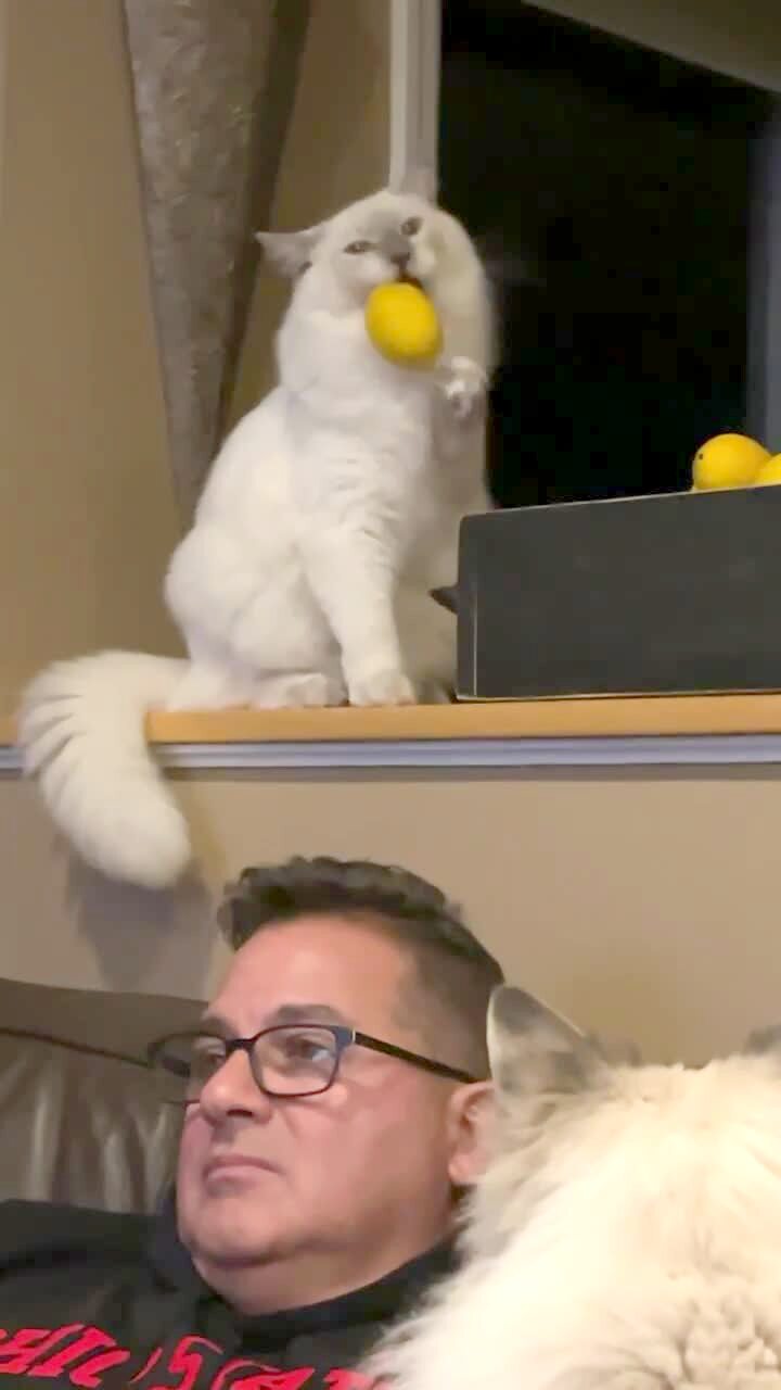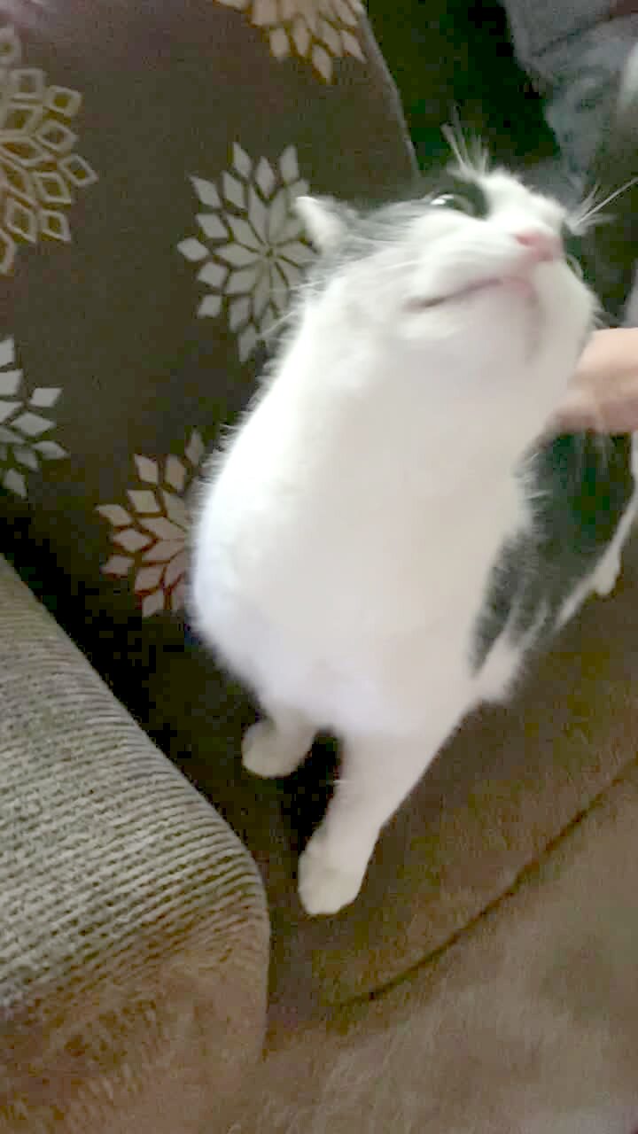 A cat in the living-room makes strange sounds, almost as if she is talking, as someone rubs her on the back.