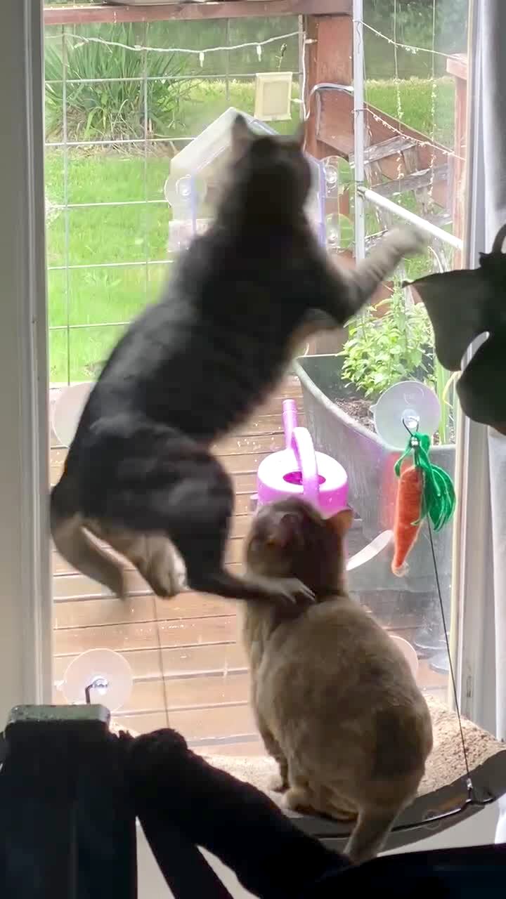 While a bird sits in a bird-feeder on a patio deck, a cat leaps in and hits the door, as the bird flies away.