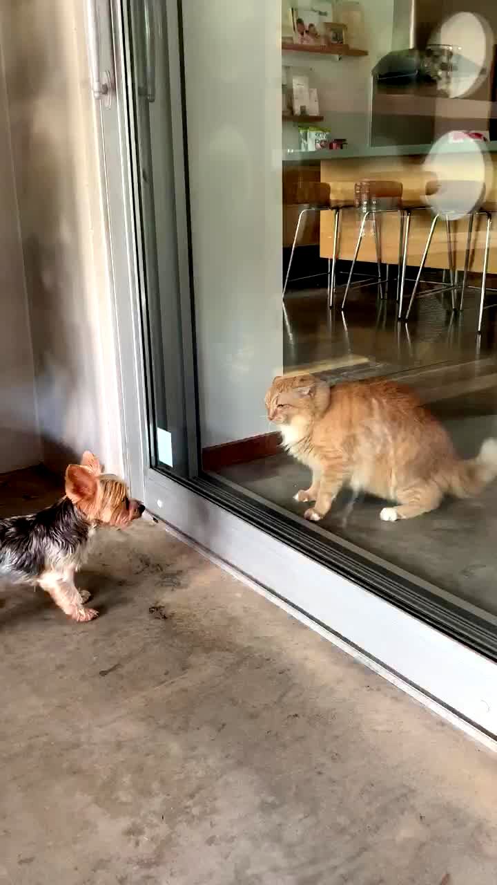 A cat and Yorkie dog bark and hiss at each other on other sides of a sliding glass door at a home. They both attack and paw and flail at the door.
