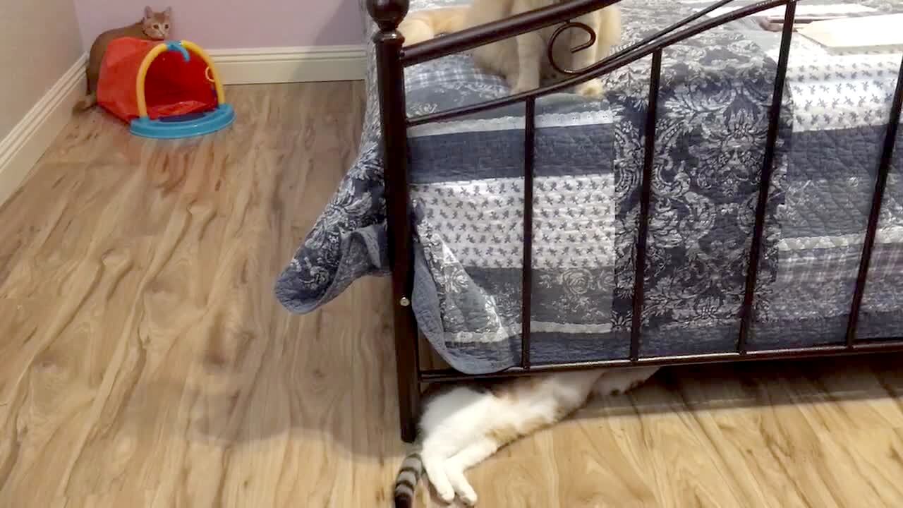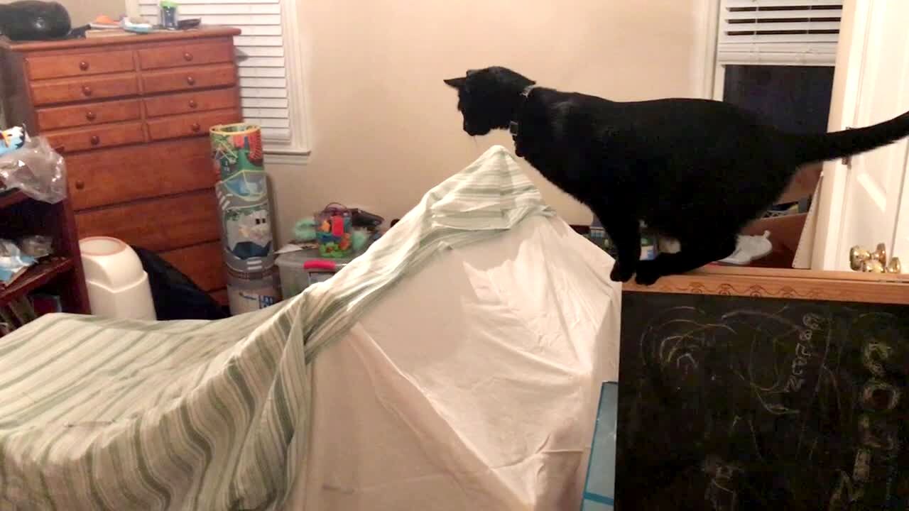 A cat walks into a cat tent and a cat on top of it jumps high into the air in a bedroom.