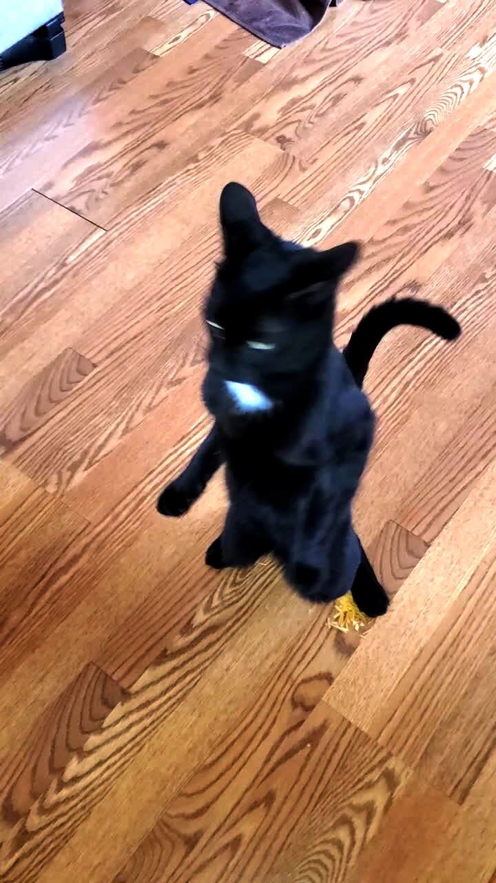 A black cat stands on its back legs in the kitchen and shakes its body from side to side.