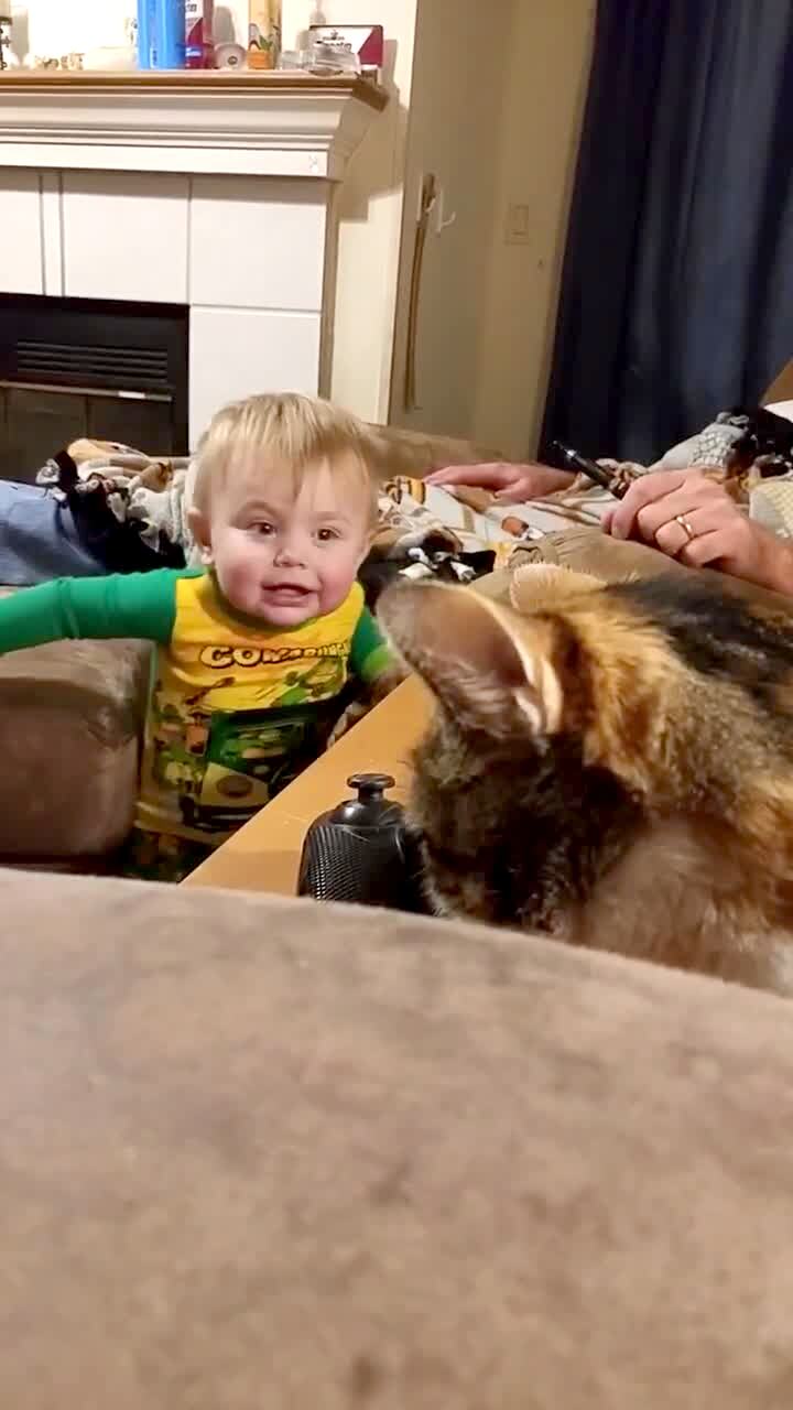 A man kicks a ball to a cat which grabs it and accidentally tackles a baby boy who is sitting on the floor while trying to retrieve it. Security footage.