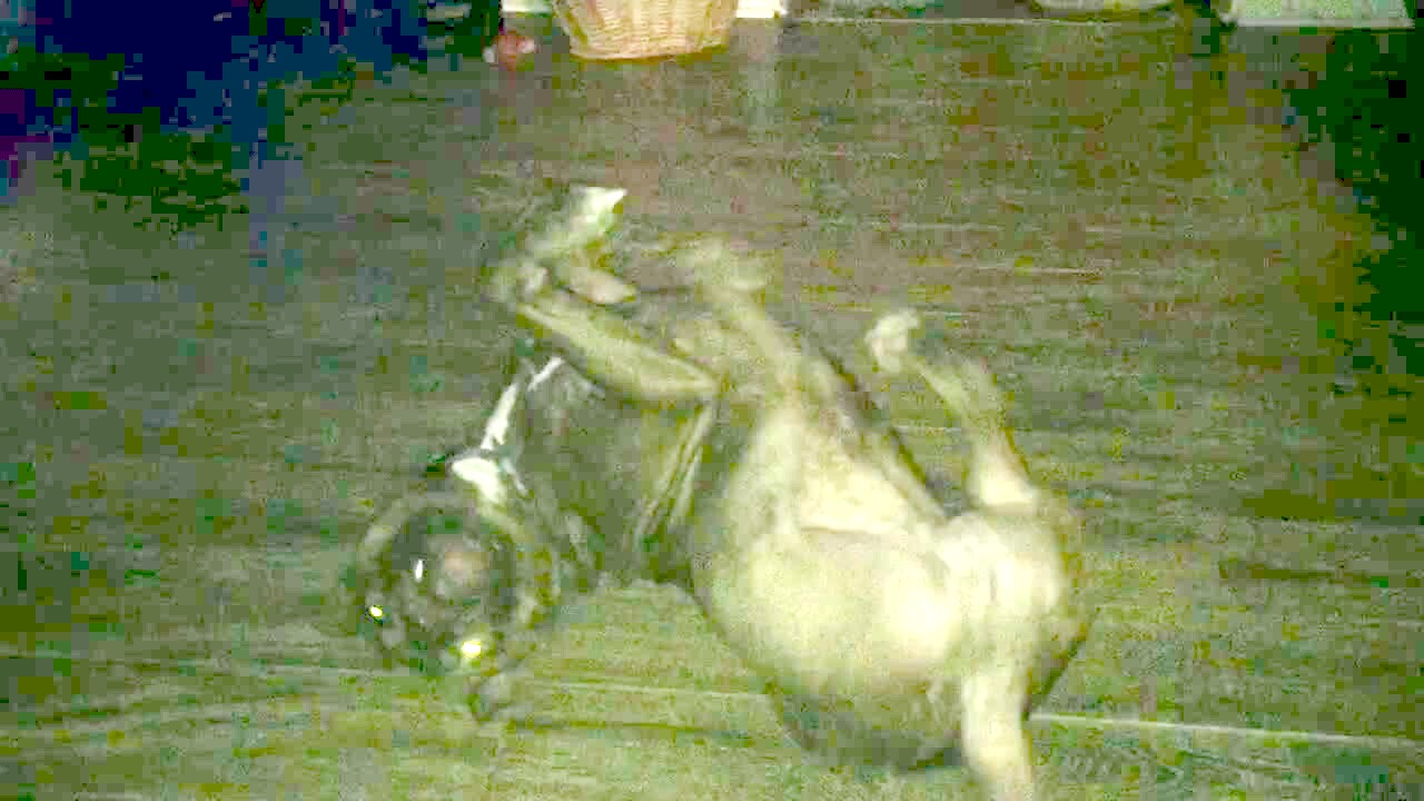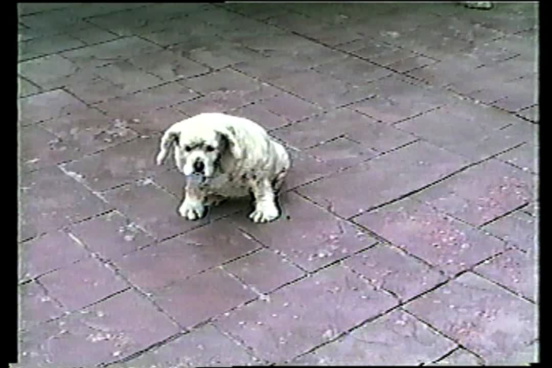 DOG SLIDING ALONG BRICK DRIVEWAY ON HIS BUTT, SCOOTING