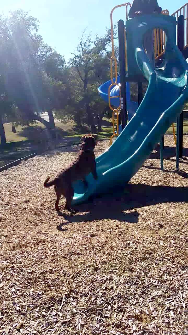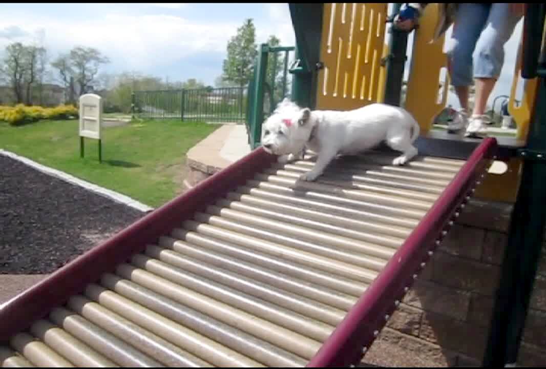A dog repeatedly tries to run up a slide.