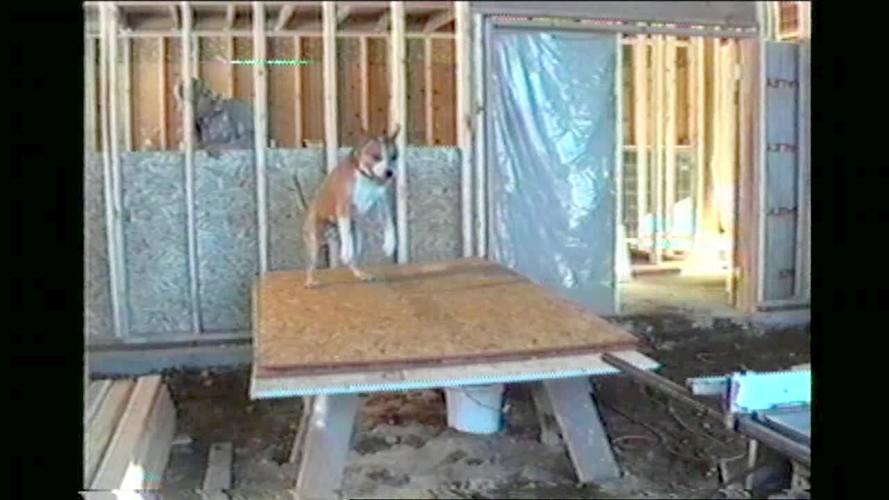 Dog entertains himself by jumping on plywood boards.