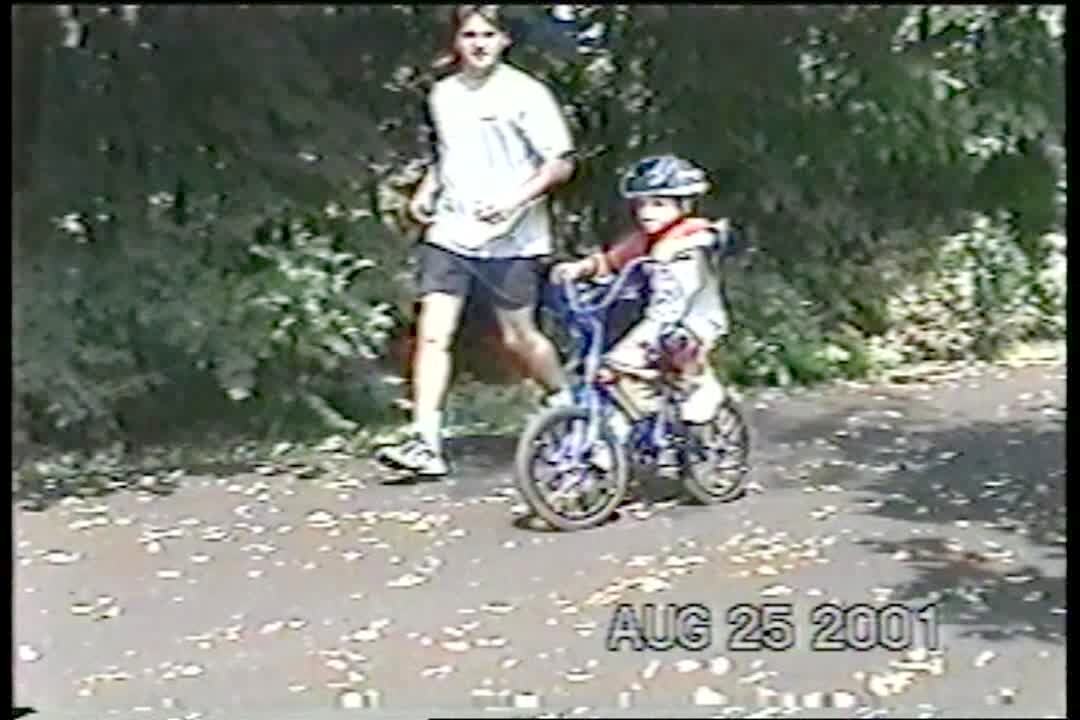A young girl learning how to ride her bike with her dad crashes into her encouraging mom behind camera.