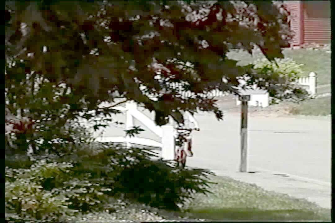 A young boy rides a bicycle and a girl follows, talking to the camera when the the boy hits a metal pole.