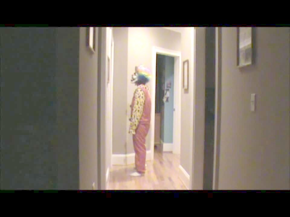 Mom dressed as clown scares teen girl in hallway, girl screams. Pranks/scares. Rainbow wig.