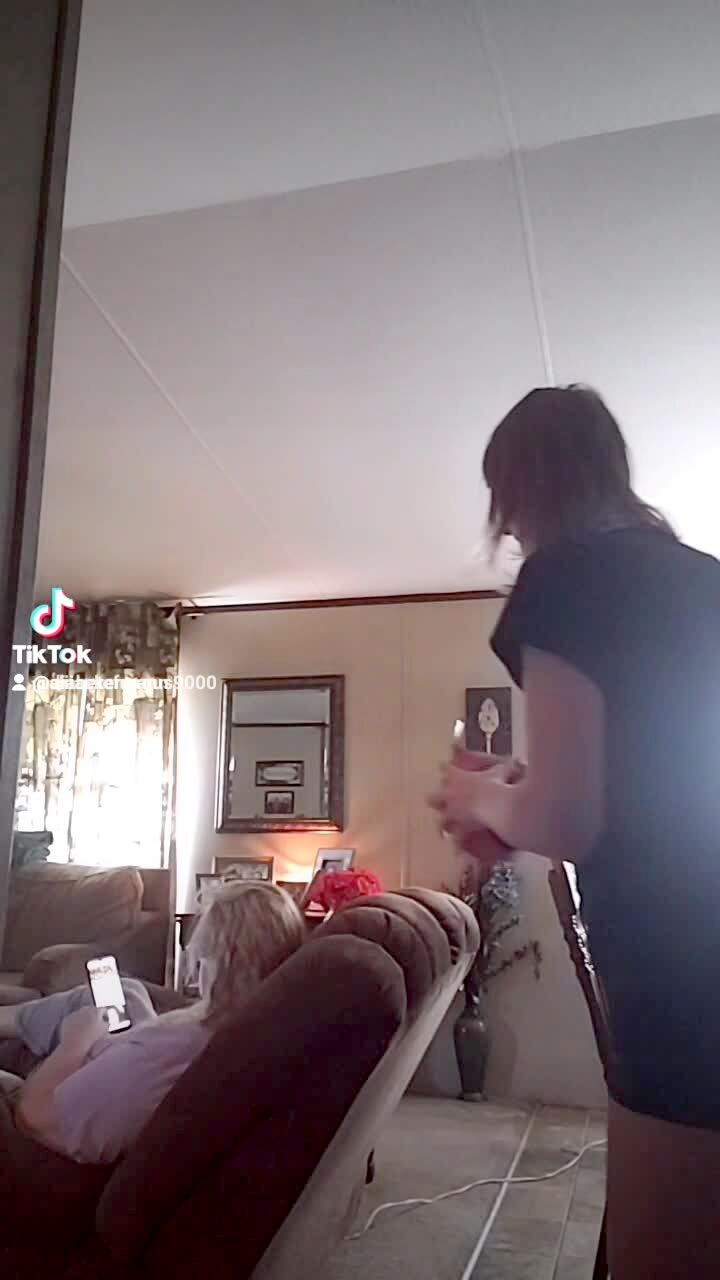 A senior woman sits on a couch in a living room and looks at her phone. A teen girl sneaks in with a whoopie cushion and blows it in the woman's ear and scares her. The senior woman screams in shock and yells, "God Bless America, Libby."