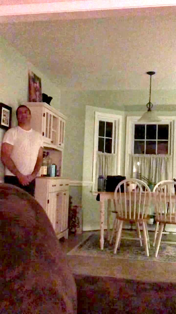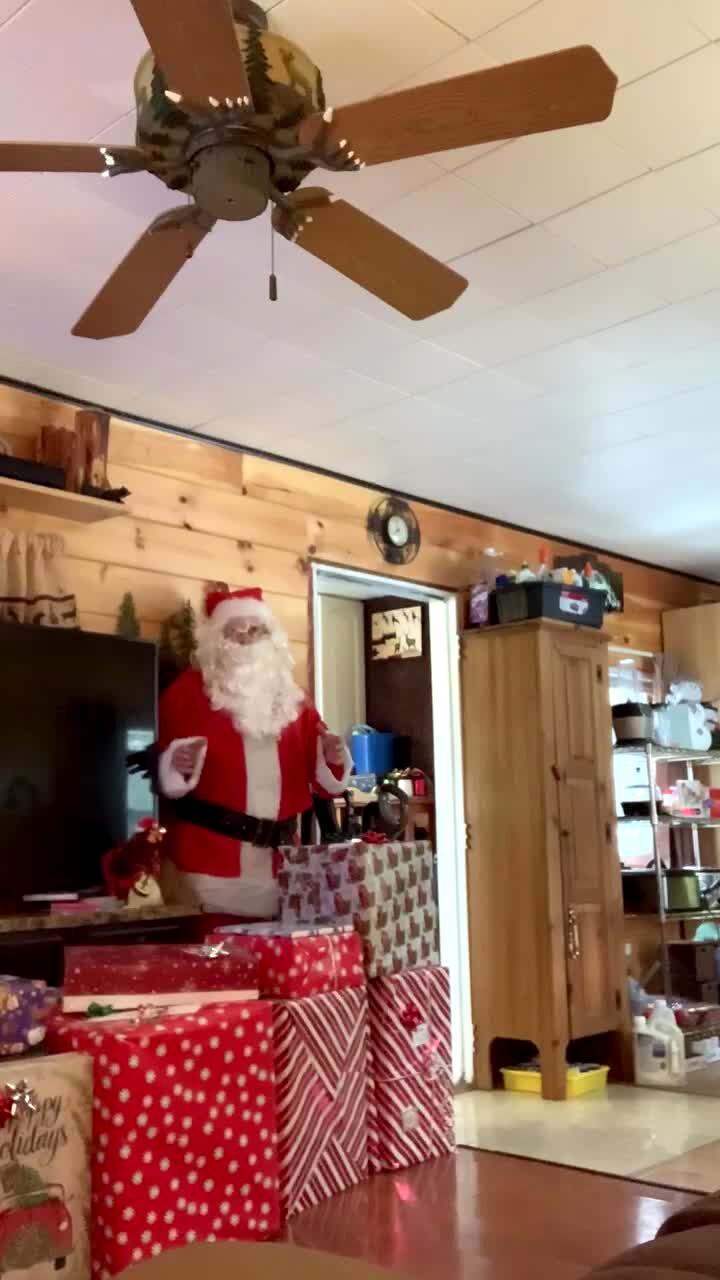 At 1:20, a man stands still in the corner of the living room dressed as Santa, then jumps and scares a woman when he says "Ho ho ho".