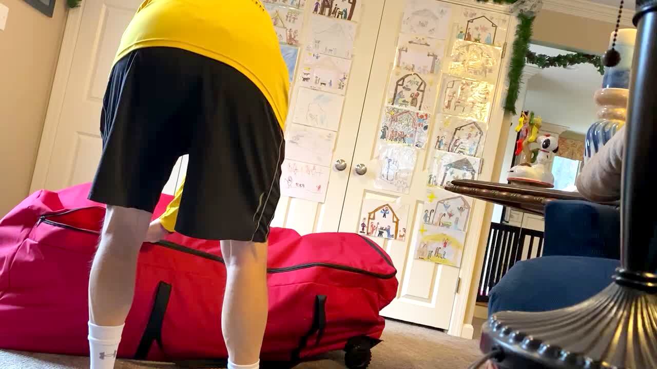 A man opens the bag for a Christmas tree in the house, and a woman hides inside to scare him. The man screams when he sees the woman and falls over.