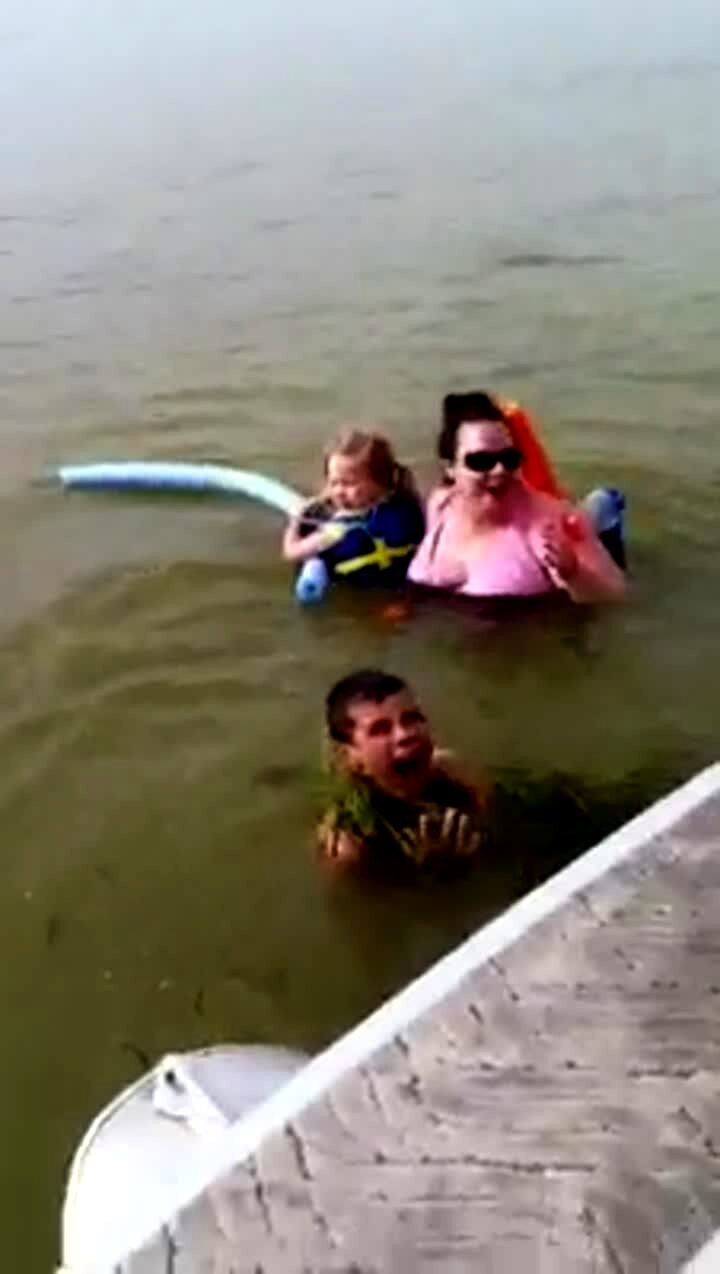 A woman backs up in a lake and screams when a boy with seaweed on his head pops up and scares her outdoors. Practical jokes.
