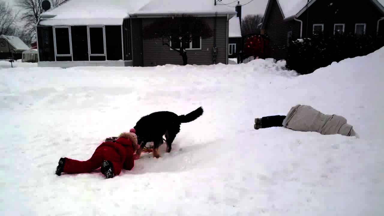 A woman goes down a hill on a sled with her kids when a black lab dog jumps right onto her and knocks them all off.