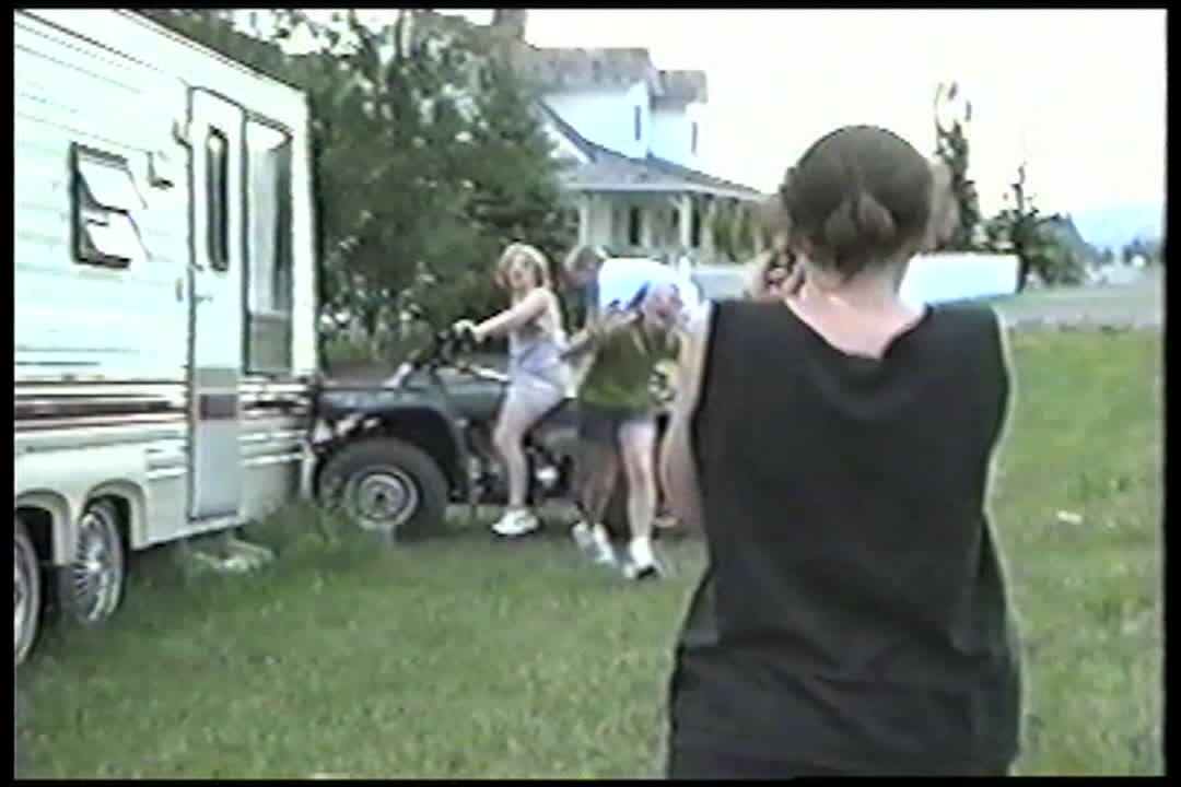 Young girl and two older children on 4 wheeler/ motorcycle/ atv. They run into camper in backyard. Short clip. Everyone is fine