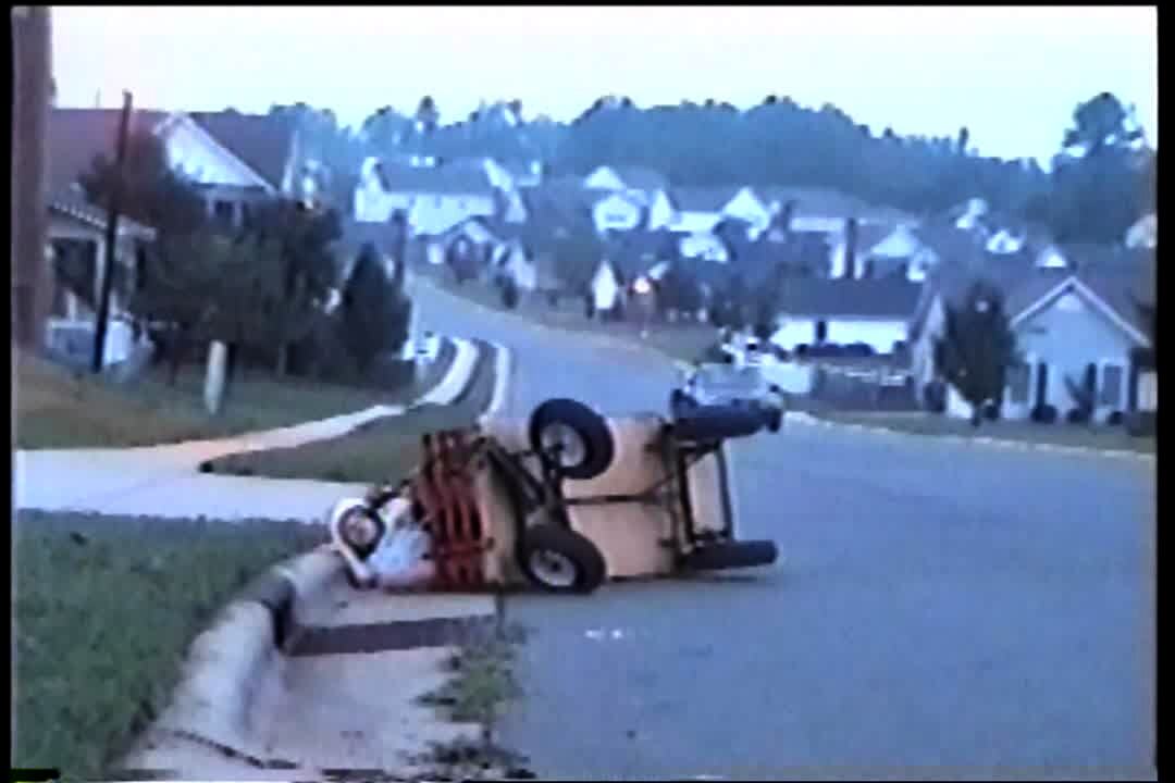 Mom lets kids drive red wagon down steep street wearing helmets. Kids go crashing into curb, they all fly out.