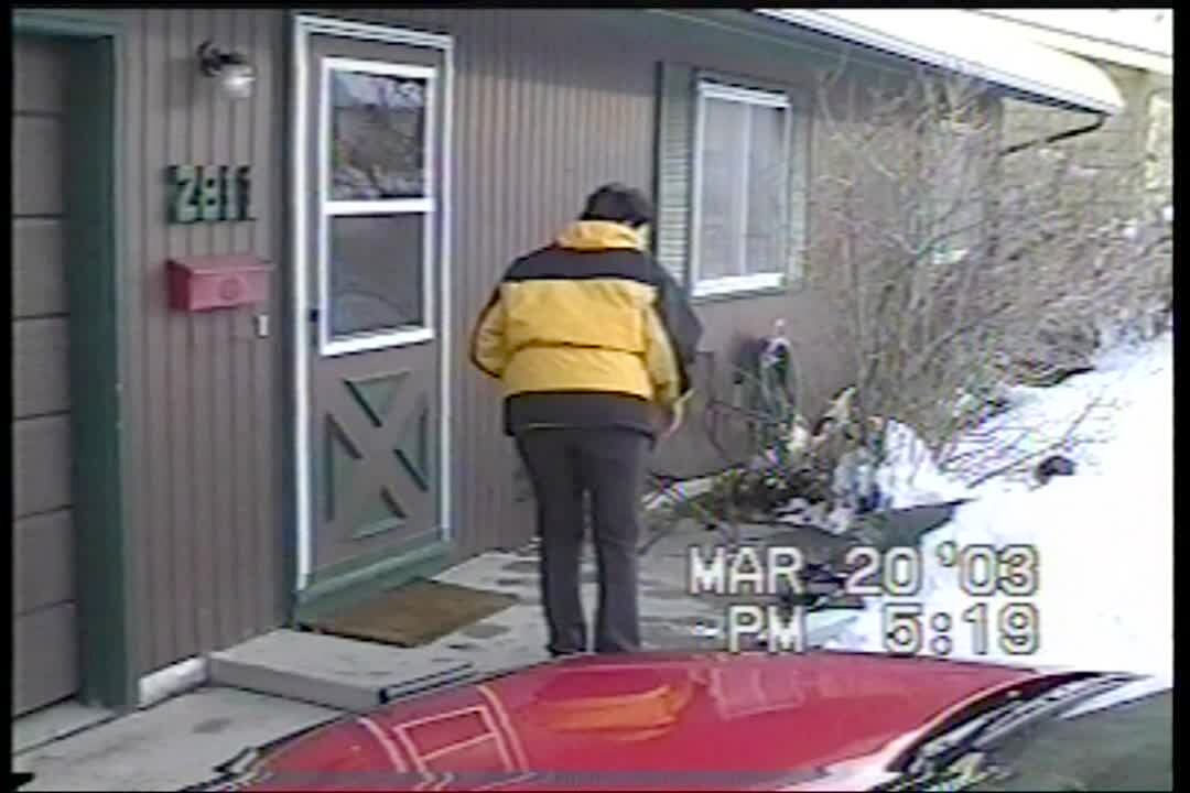 A woman hides inside a cardboard box on a porch and scares a senior man and woman. Security footage.