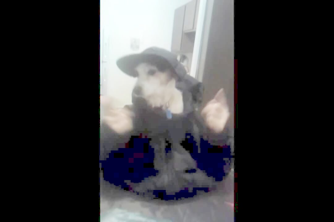 A dog with human hands is dressed like a rapper and appears to be making rap hand gestures.
