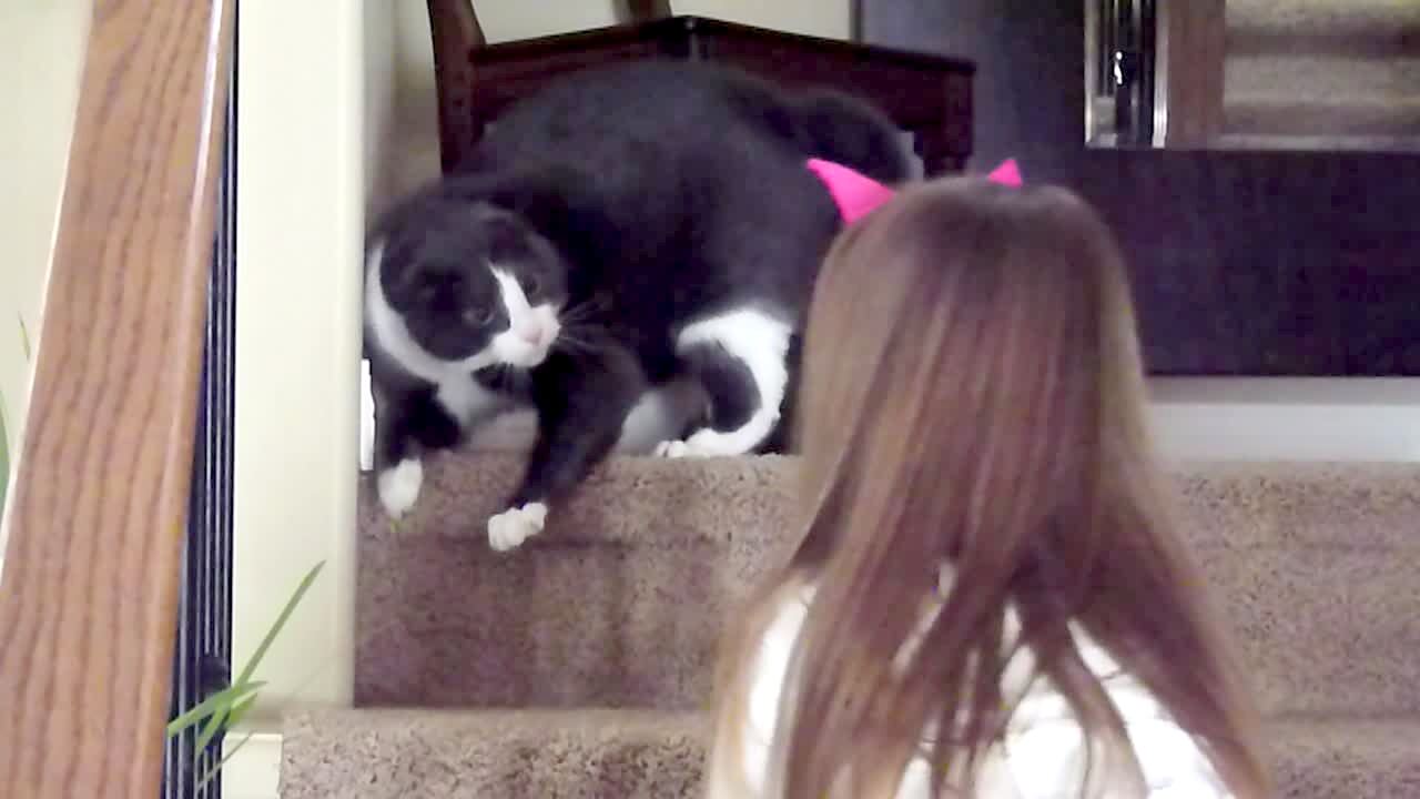 A little girl dressed as a cat is hopping on stairs and getting in a cat's face. The cat is scared and is backing away. Reveal of the girl's cat face at 0:20.