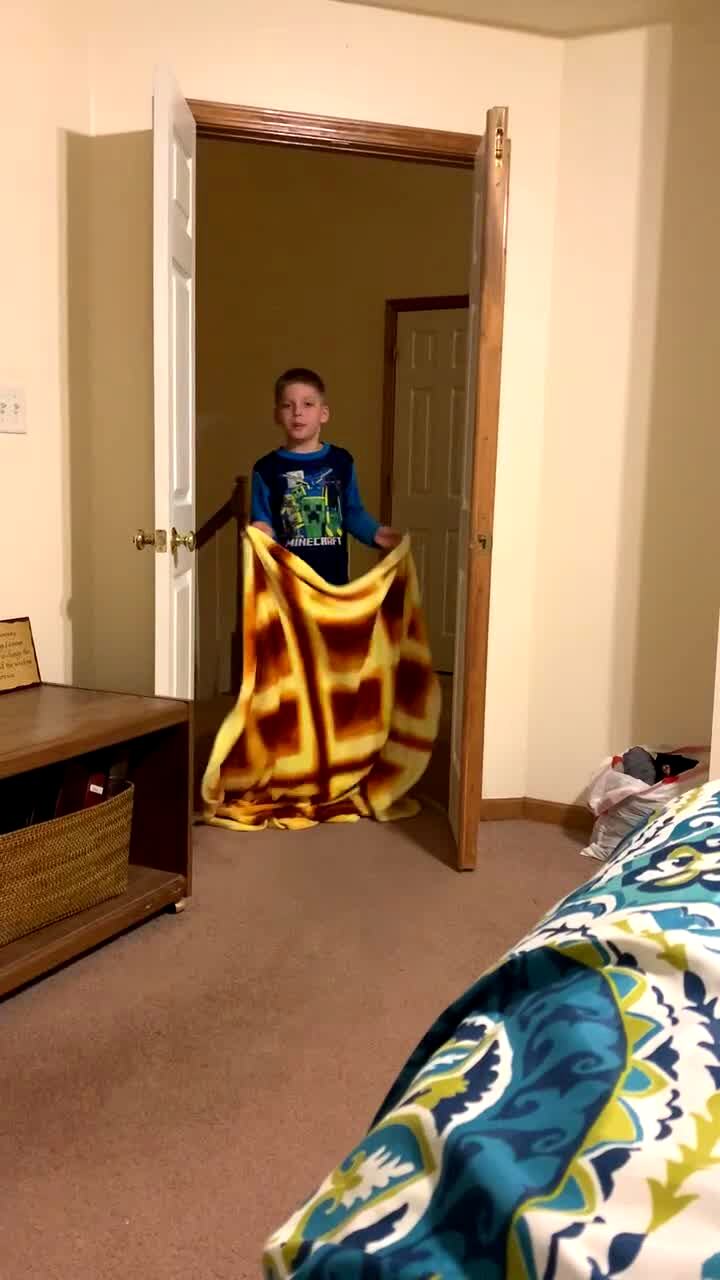 A young boy stands in a bedroom doorway and tells a woman that he will "disappear and then reappear as your laughter," then he throws a blanket the air and hits his head on the door.