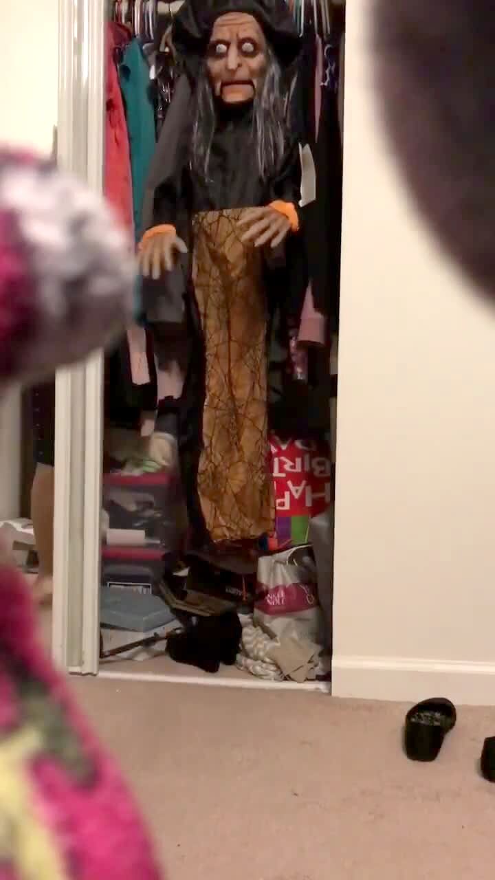 A man pranks his wife and hides a scary witch Halloween statue in her closet. The woman walks in her room, opens the closet door, and screams, cursing out her husband.