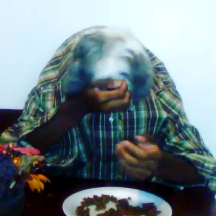 A man scratches his dog's head as the dog eats food out of his hands while they sit at the dinner table in the same button up shirt as the man does the dog with human hands challenge.