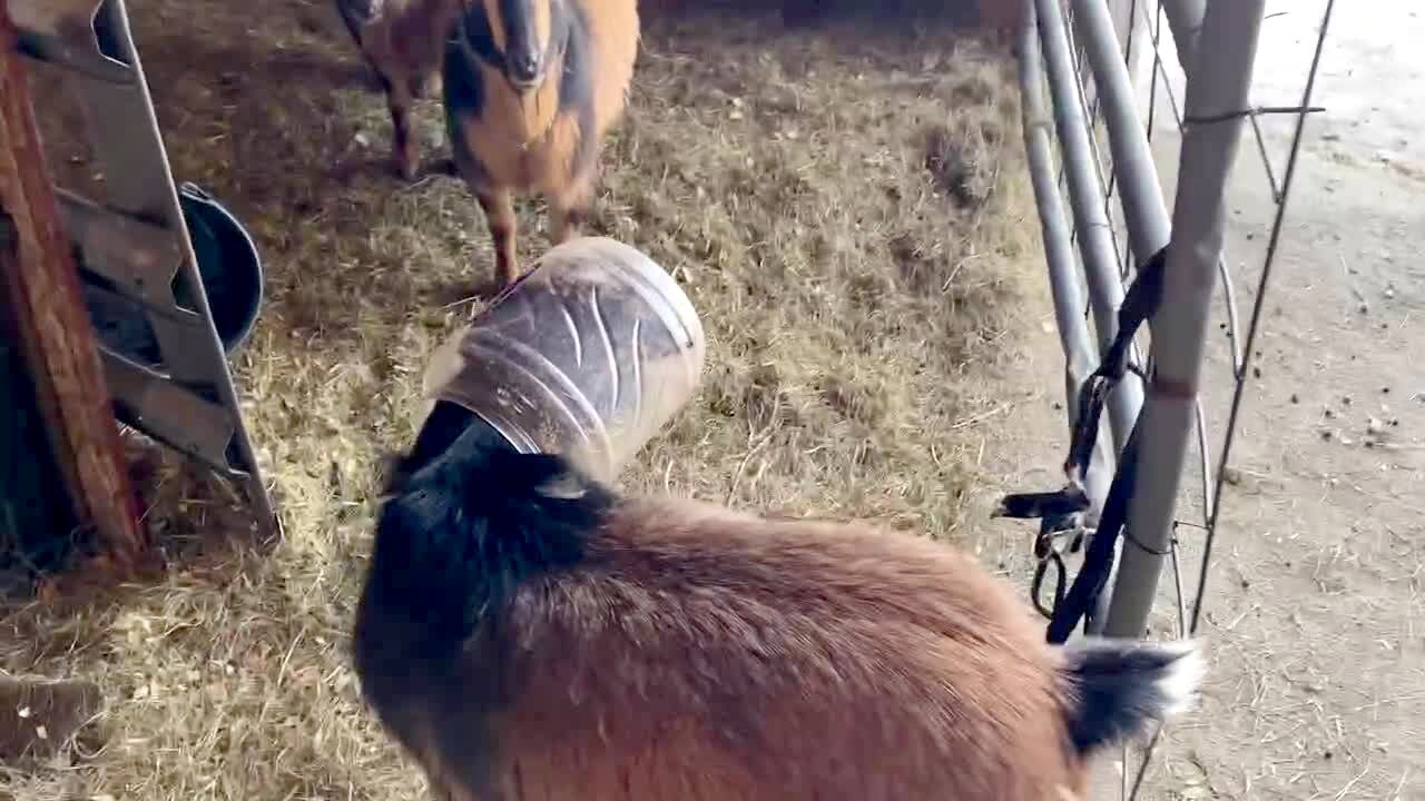 As a prank, a woman tries to pour a pitcher of water over the top of the shower curtain in a bathtub. But when she leans on the shower curtain rod, the rod collapses and she falls and breaks the toilet seat.