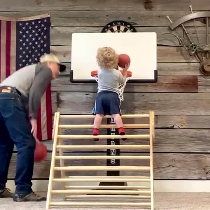 A man films himself and a tot boy who pretends to cut the mans hair. The boy then picks up a pair of real scissors and actually cuts the man's hair. The man reacts with fear and jumps up out of the chair.