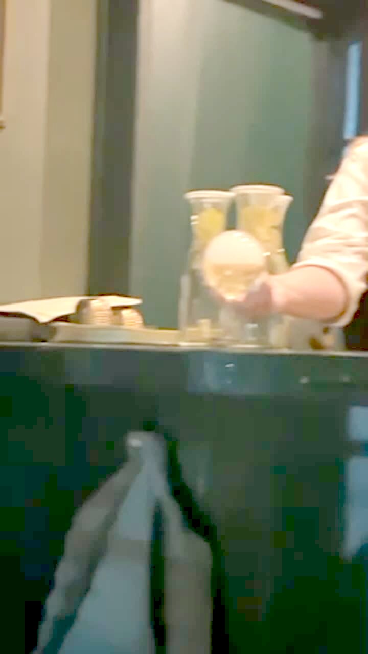 A woman in a bar makes a drink with a large bubble on it. She then she passes it to a young woman who takes the drink and slowly and carefully walks backwards until she trips onto a couch and spills the drink.