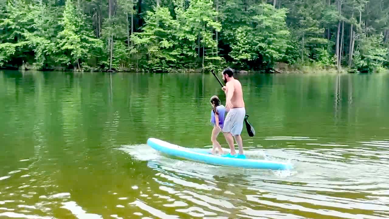 A man and young girl balance on a paddle board in a lake and the man ends up falling forward onto the girl and they splash into the water.
