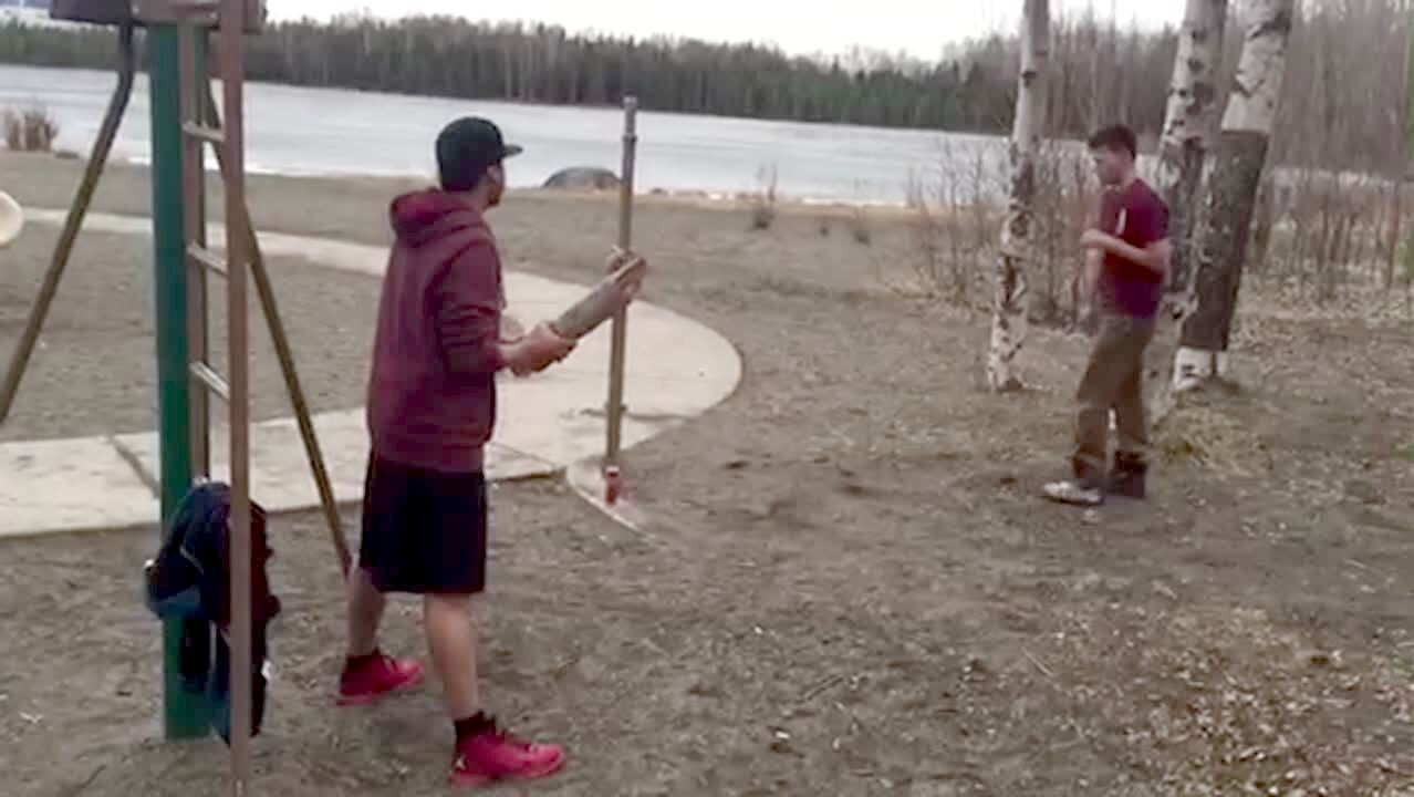 A man throws a log behind his back into a plastic bucket, convinces his friend to try, then switches to bucket with a shovel, hitting his friend in the crotch.