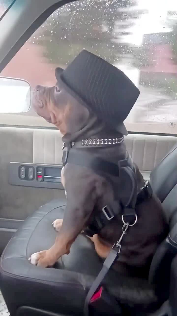 A stocky dog rides in the front seat of a vehicle while he wears a Fedora hat. A man carries on a conversation about the rain and the dog looks at him each time the man speaks, as if he's engaged.