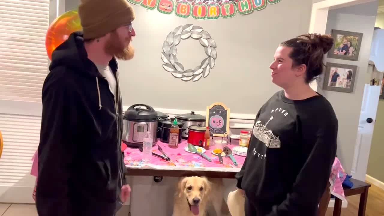 A man and a woman do the tortilla slap challenge in the dining room. The woman slaps the glasses off the man.