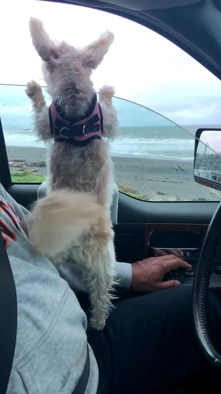 A man opens a car window for a puppy dog at the beach. She sticks her head out the window, then her ears go straight up in the wind.