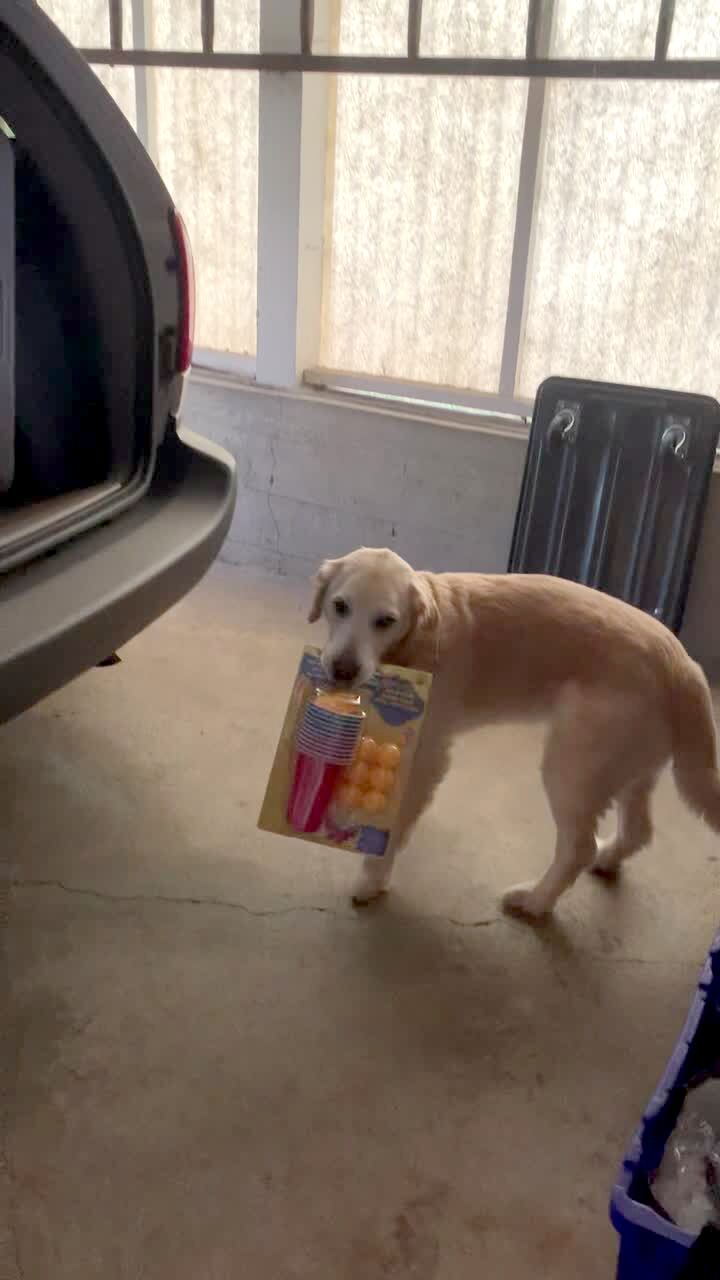 A golden retriever dog walks around in a garage with a beer pong set in her mouth while a man loads a car with boxes, and the woman behind the camera tells the dog that they do not have time to play beer pong.