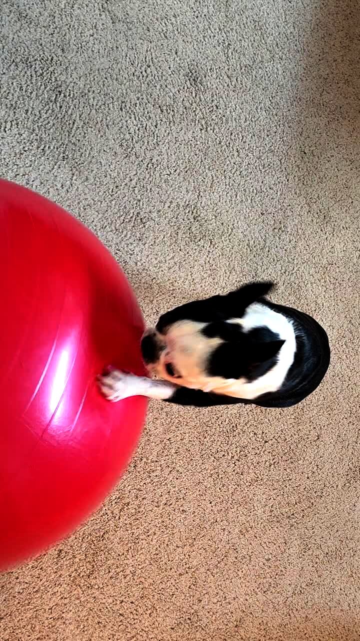 A Boston Terrier dog paws rapidly at a red yoga ball in the bedroom.