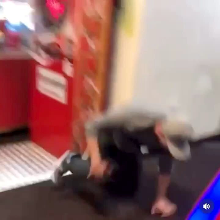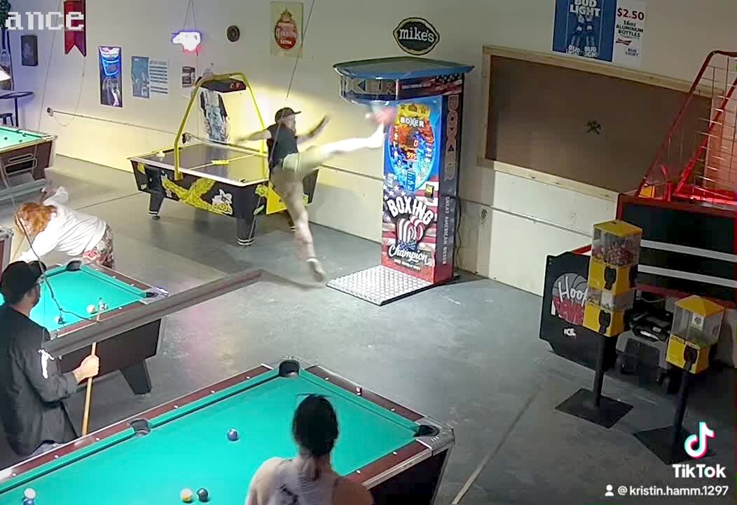 A man at the bar tries to kick a boxing arcade game punching-bag but he slips and falls. Security footage. Featured talent cleared (the man who kicks the punching bag).
