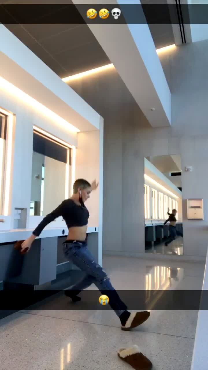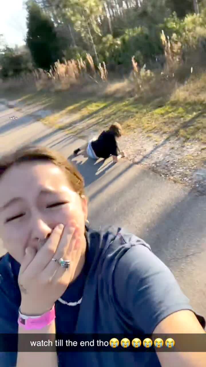A woman films herself as she skateboards. The man skating with her attempts to keep up but falls off his skateboard, spilling his beverage everywhere, causing the woman to laugh. Music rights not cleared.