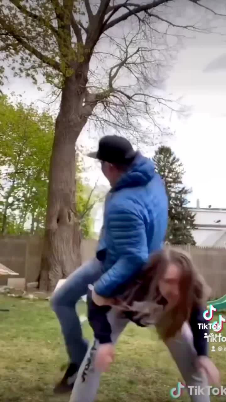 A man and a teen girl do a TikTok dance and he tries to roll across her back but they both fall to the ground in the backyard. Music rights not cleared.