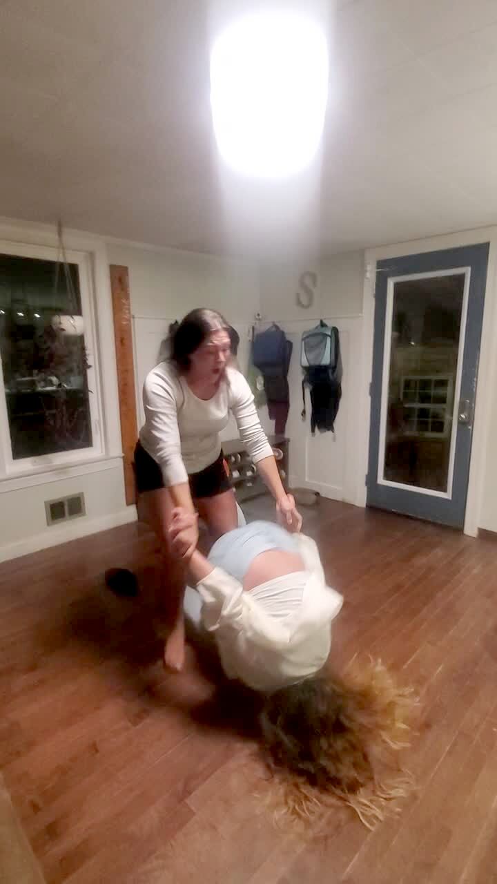 Two women try to do a tandem yoga pose and one woman tries to step onto the other's thighs but she falls on her face in the living-room.