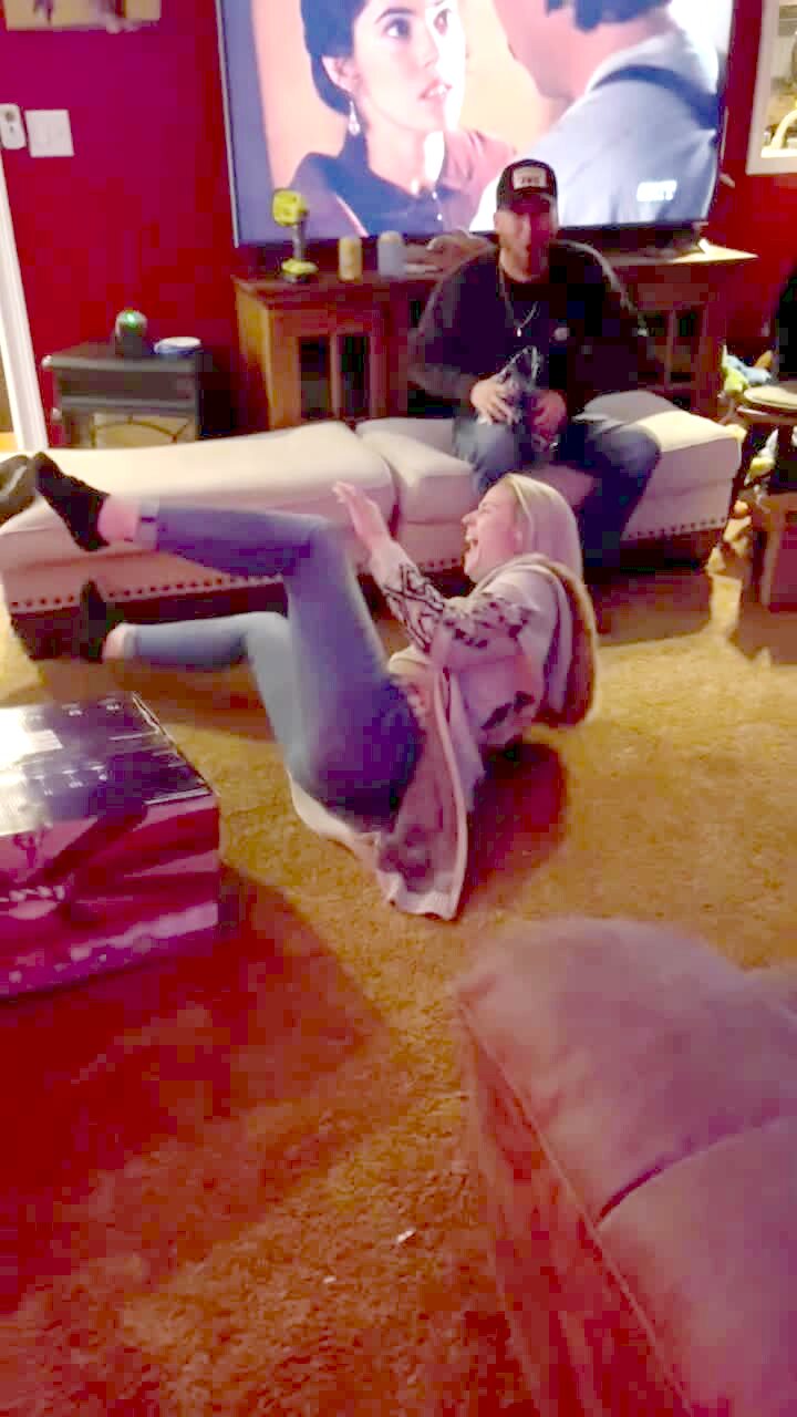 A man with a mouse filter holds a woman on his shoulders while he sits on a chair in the living room and then they lean too far back and both fall out of the chair. Snapchat.