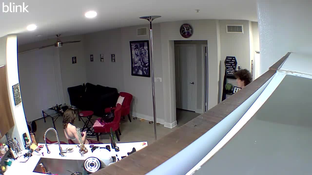 A man runs and jumps on a stripper-pole and swings around it and it falls and he falls with it into the kitchen counter. Security footage.