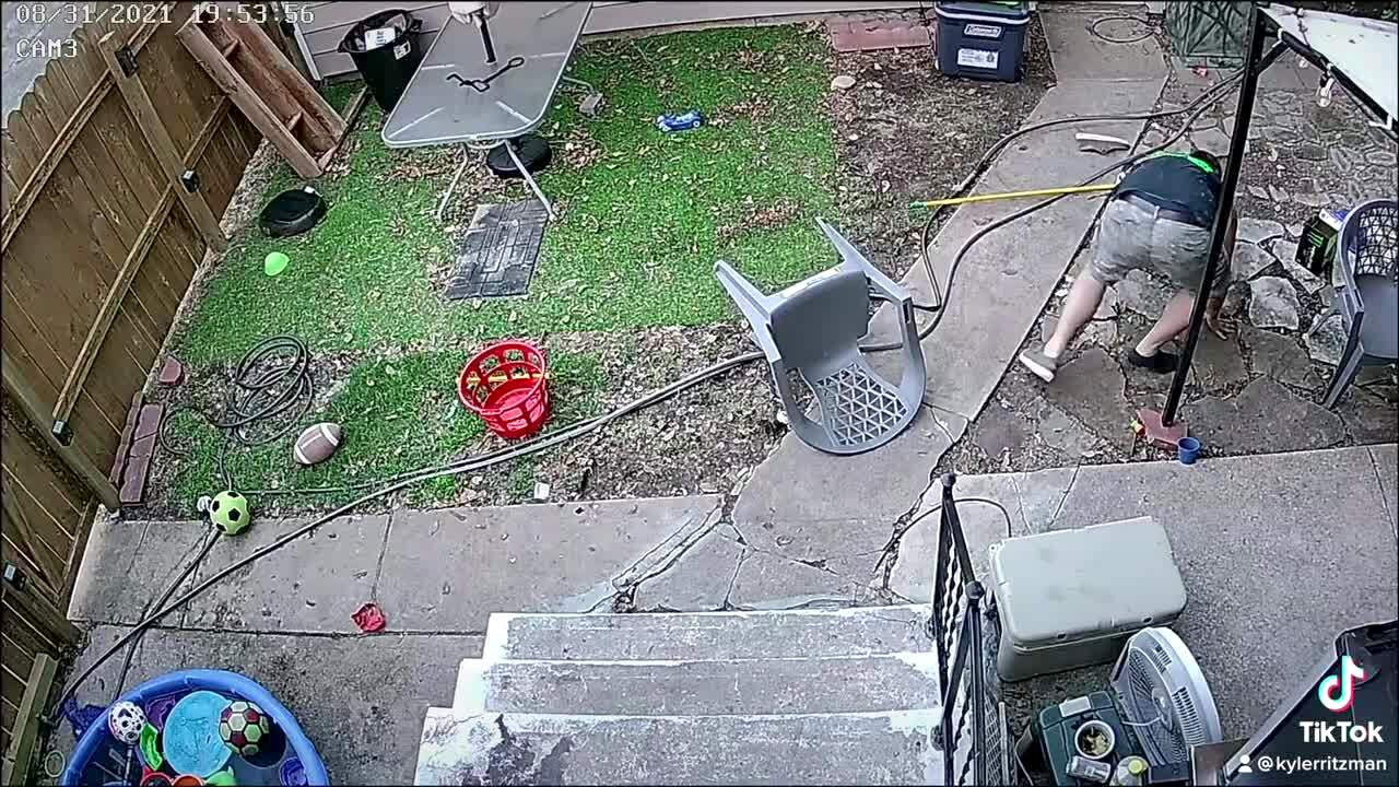 A man walks into the backyard and tries to kick a plastic chair but gets his foot caught and falls on the sidewalk. Security footage.