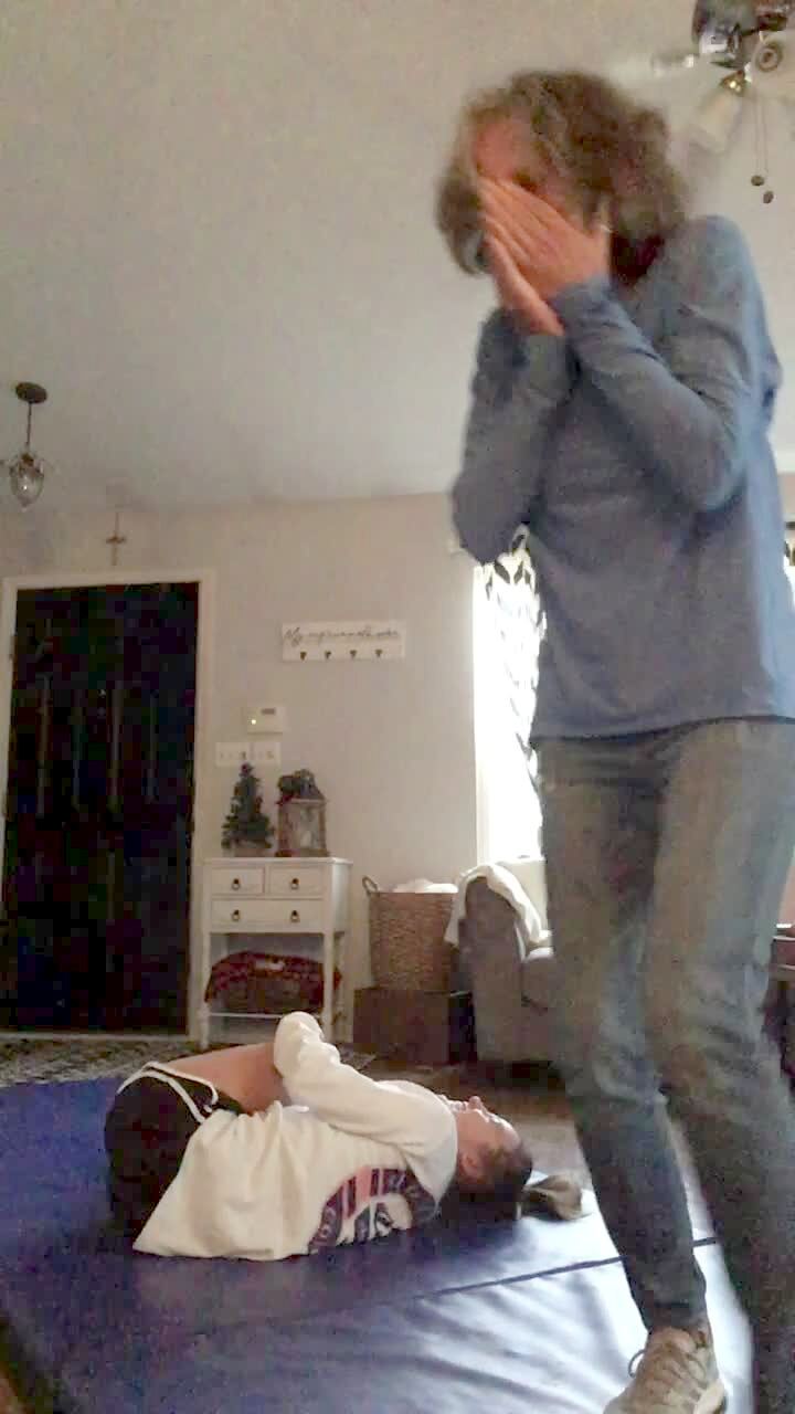 A woman tries to help her teenage granddaughter practice a backflip in the living-room but she accidentally kicks the woman in the face.