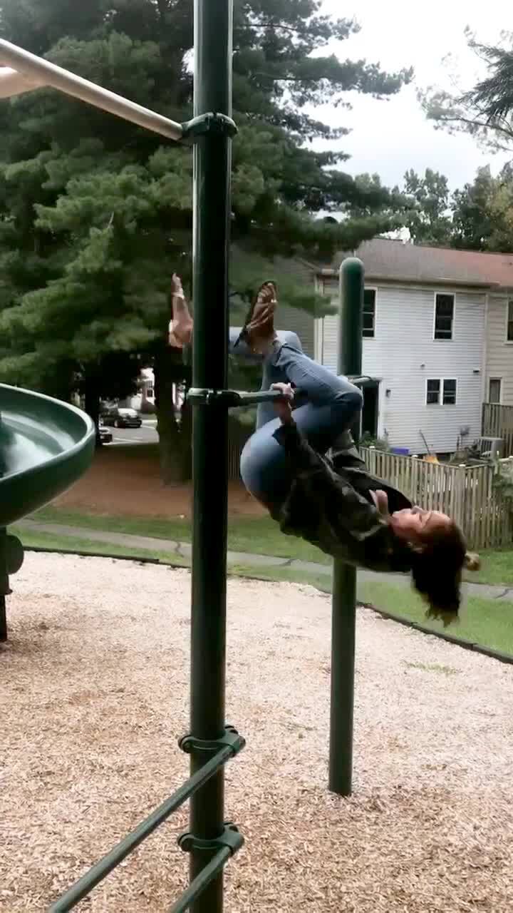 A woman spins around on a bar on the playground and she flips upside down and falls on the ground.