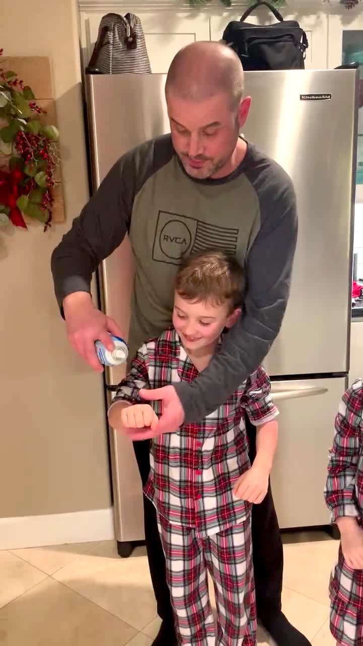 A man does the whipped cream challenge, and then a young boy does it and catches it in his hand. A young girl tries next, but she flings it up and it lands on the man's head.