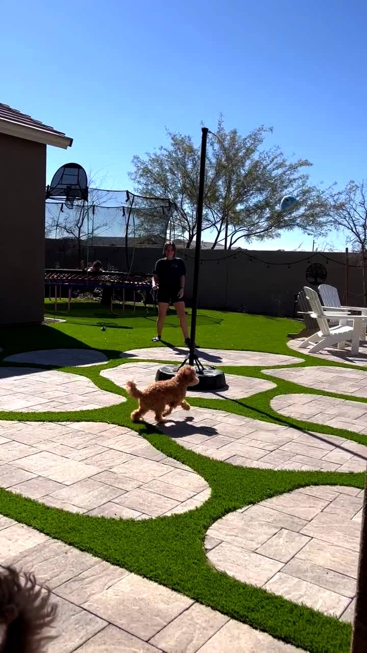 A woman in the backyard hits a tetherball around a pole. A dog chases the ball's shadow and the family laughs.