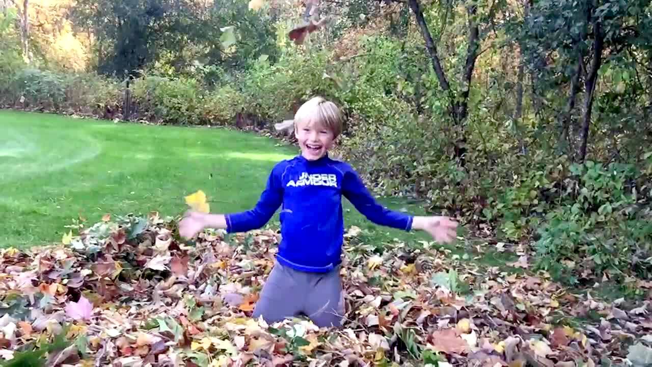 A young boy sits in a pile of leaves in the yard of a home. He tosses leaves in the air and a golden retriever puppy jumps on top of him. The dog then jumps knocks the camera to the ground.