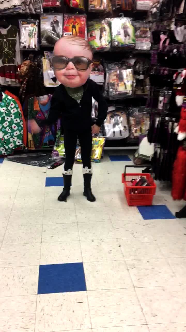 A teen girl wears a large baby face mask in a Halloween store and floss dances.
