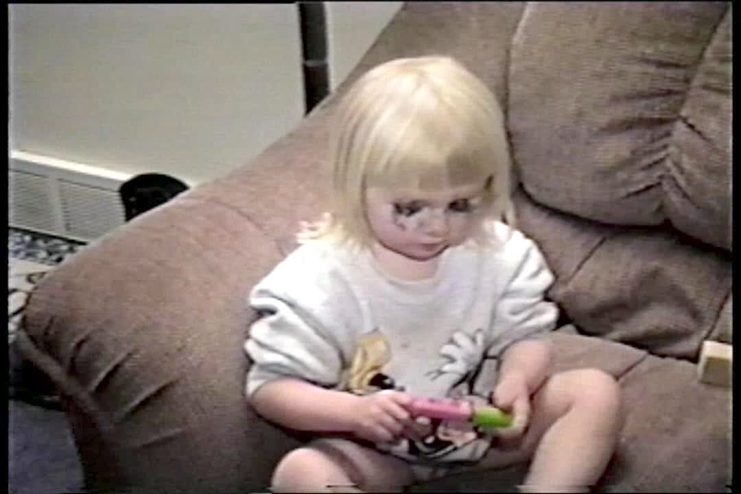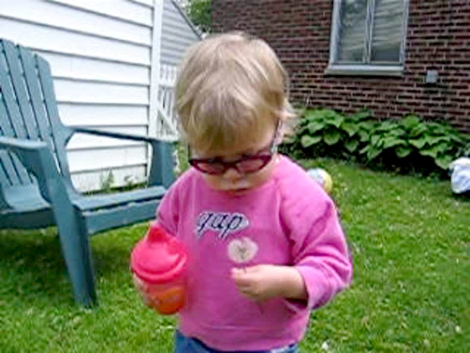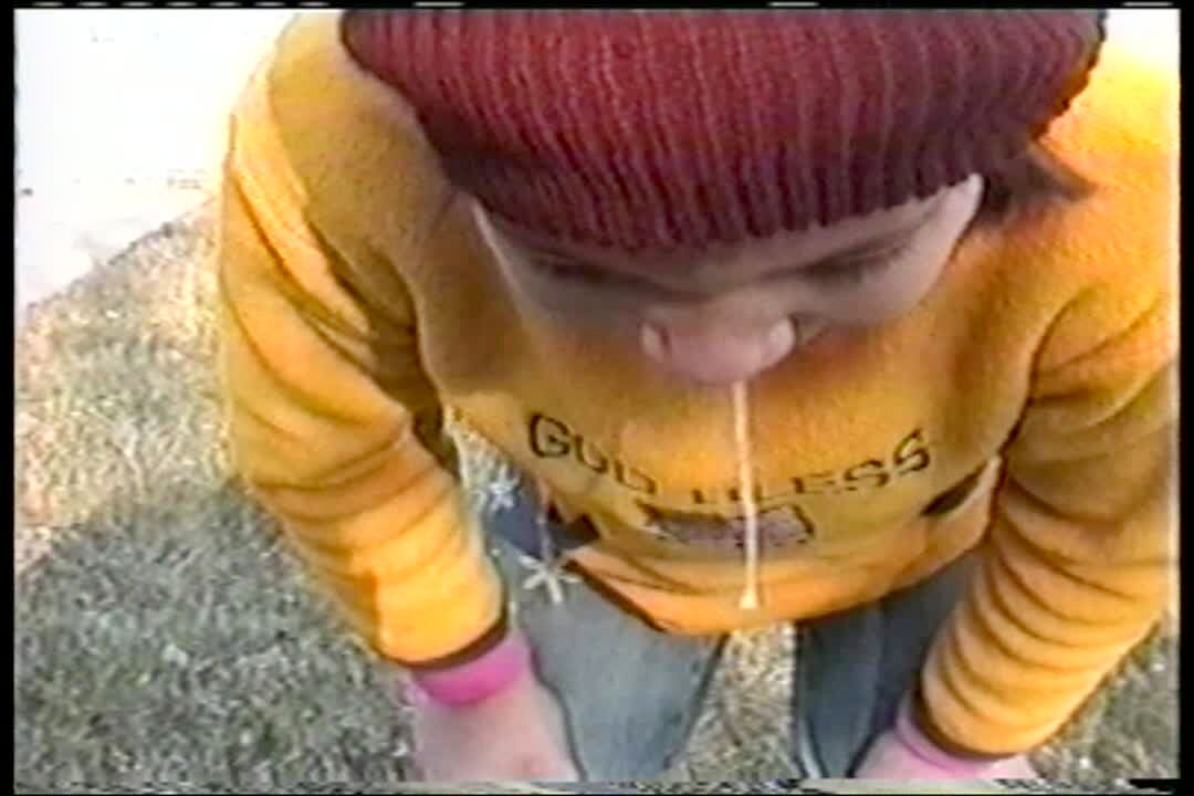 Young girl has a runny nose. She looks down & a string of snot comes out, then she sucks it back up. She does this twice & smiles.