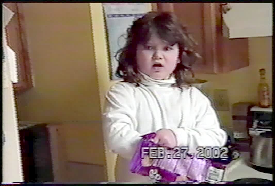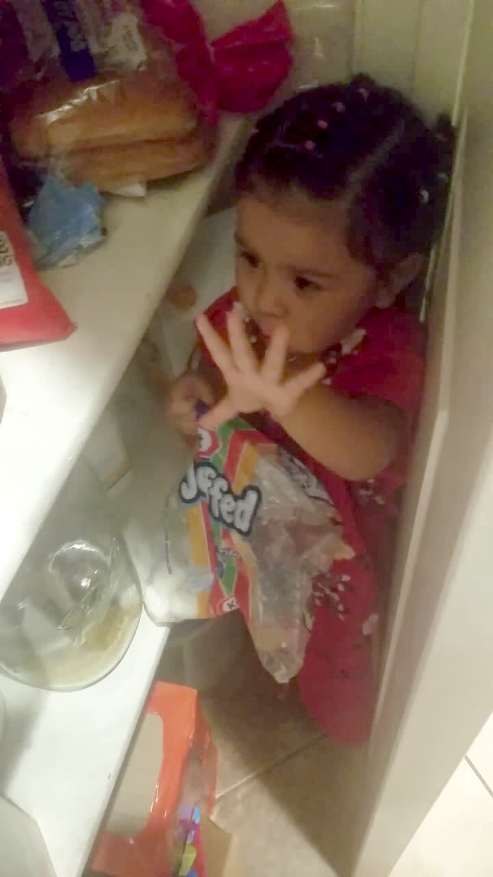 A tot girl hides in a pantry and eats marshmallows and hides them and pretends she isn't eating them.